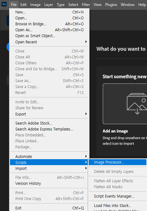File > Scripts > Image Processor메뉴를 선택합니다.