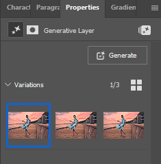 Window > Properties를 선택하여 속성창을 열어보면 3개의 결과물이 생성된 것을 확인할 수 있습니다. Generate버튼을 클릭하면 추가로 더 생성할 수 있습니다. 각각의 이미지 섬네일을 클릭해 본 후 가장 맘에 드는 결과물을 선택하면 됩니다.