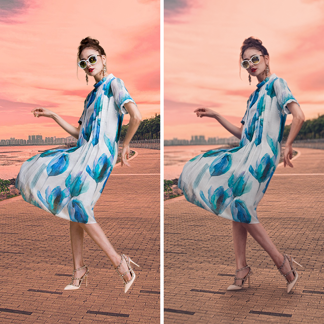 배경제거를 통해 모델만 보이도록 수정했으니 이제부턴 배경에 어울리게 모델이미지의 색상을 보정해야 합니다. 얼마 전까지만 해도 피사체와 배경의 노출이나 빛 수정 등은 너무 힘들거나 불가능한 경우도 많았습니다. 하지만 AI의 발달로 이러한 작업이 클릭 한 번으로 가능해졌습니다.
