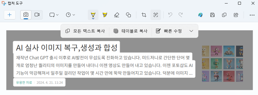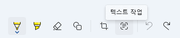 상단의 메뉴 중에서 오른쪽에 있는 문서모양의 텍스트 작업 아이콘을 선택하면 캡처한 이미지에서 문자를 자동으로 인식하고 추출해 줍니다. AI채팅으로 이미지 첨부하고 텍스트를 추출해 달라고 해도 되지만 귀찮기 때문에 저도 캡처도구를 애용하고 있습니다.