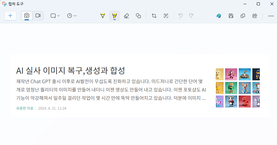 캡처된 이미지를 편집하고 싶다면 알림창을 선택해 주세요. (다른 작업을 하면 알림 창이 사라져 버리기 때문에 주의해 주세요) 캡처도구 창이 열리고 캡처한 이미지가 보입니다.