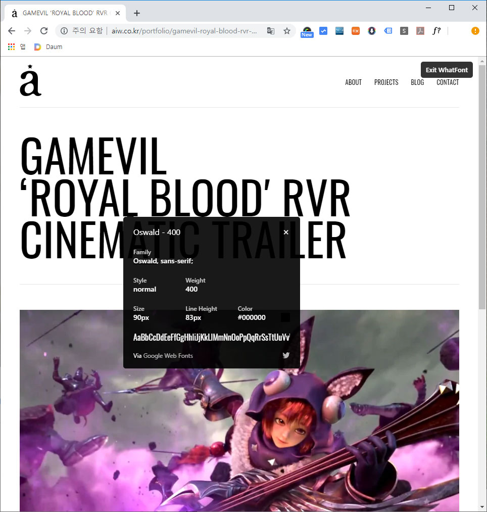 이미지로 되어 있는 폰트는 속성을 알 수 없지만 웹폰트의 경우에는 소스를 추적해서 어떤 폰트인지뿐만 아니라 폰트의 속성까지도 알 수 있습니다. 요즘은 비쥬얼 영역의 폰트도 웹폰트로 적용해서 사용하는 경우가 많아서 아주 유용하답니다.