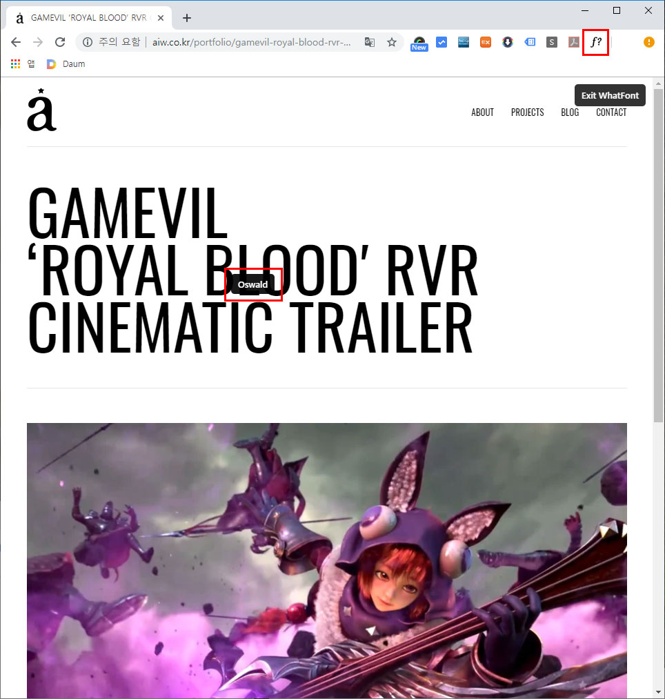 이제 실제로 폰트를 알아보도록 하겠습니다. 웹서핑중 맘에드는 폰트가 있는 페이지가 나오면 브라우저 우측상단의 'f?' 아이콘을 클릭해 줍니다. 이제 마우스를 찾기 원하는 폰트위로 이동합니다. 아래 그림를 보시면 현재 마우스커서가 위치한 곳에 'Oswald'서체정보가 뜬것을 알 수 있습니다.
