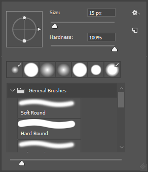Path를 생성한 후 브러시 툴을 선택해 줍니다. 상단의 옵션에서 사이즈를 15px, hardness를 100%로 설정해 줍니다. (상단에 있는 이미지 크기 기준입니다. path를 따라가는 브러시이기 때문에 path의 크기에 맞는 적당한 크기를 설정하시면 됩니다.)